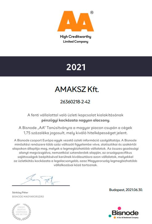 Az AMAKSZ Kft. a Bisnode AA (dupla A) tanúsítványát kapta meg, mely azt jelzi, hogy velünk történő üzleti kapcsolat kialakításának pénzügyi kockázata nagyon alacsony.